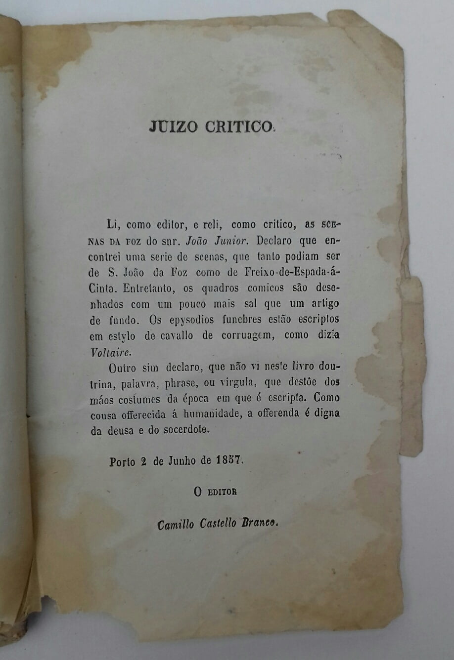 As capas de brochura são inexistentes , mas possui páginas de guarda com pequenas anotações e com manchas . O corte das folhas é muito irregular ( tamanhos diferentes). A estrutura caligrafada está imaculada, com manchas e picos de acidez, sem relevo para a obra. No seguimento da página 298, há o Juizo Critico, do Editor, Camillo, datado de Porto, 2 de Junho de 1857.