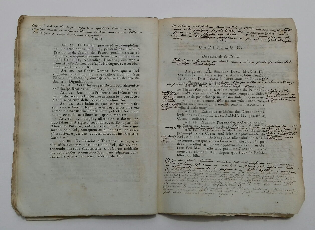 Carta Constitucional sem as capas de brochura, mas em bom estado no seu miolo. Apresenta variadíssimas notas manuscritas a remeter para estudos, ou a complementar informação. Foi pertença de um par do reino de Torre de Moncorvo. Obra completa.