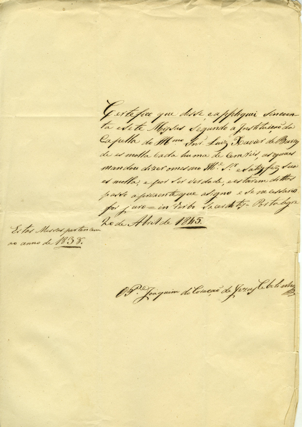 Comprovativo de missas, assinado pelo padre Joaquim do Coração de Jesus Cebolinho, 1845, PORTALEGRE