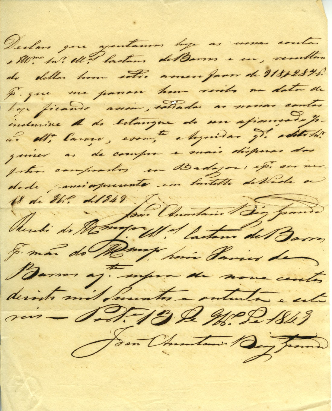 Liquidação dada dívida de Manuel Caetano de Barros, 1849.