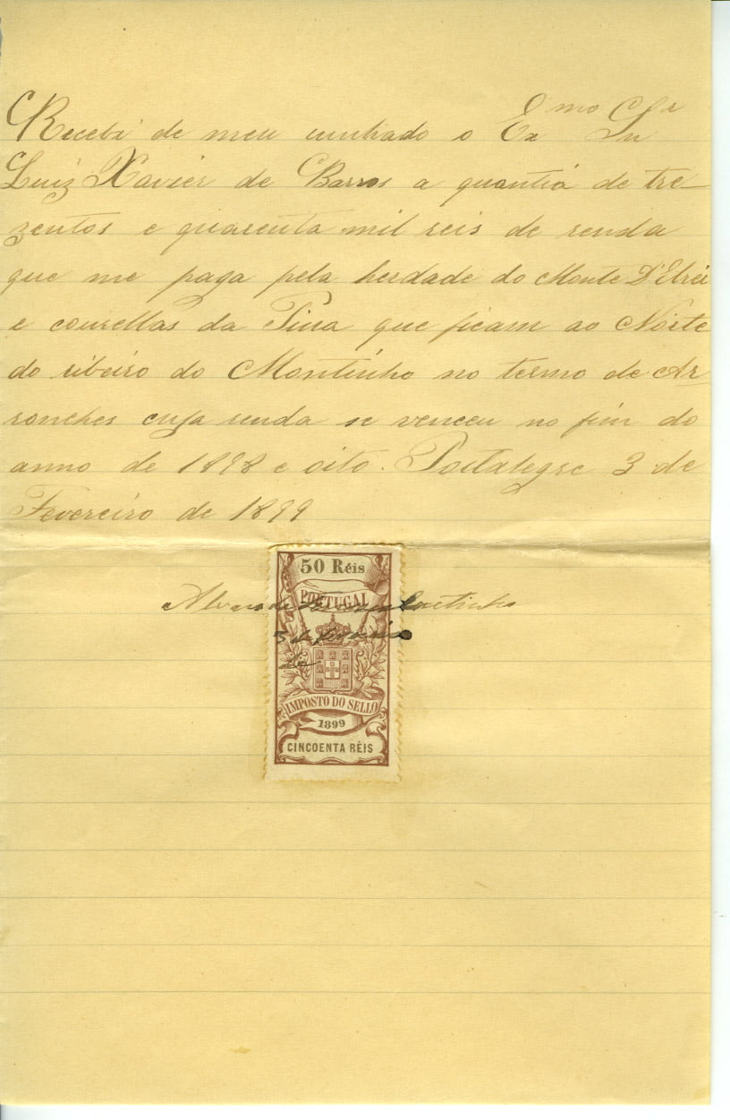 Recibo emitido por Álvaro da Fonseca Coutinho, 3 de Fevereiro de 1899, PORTALEGRE