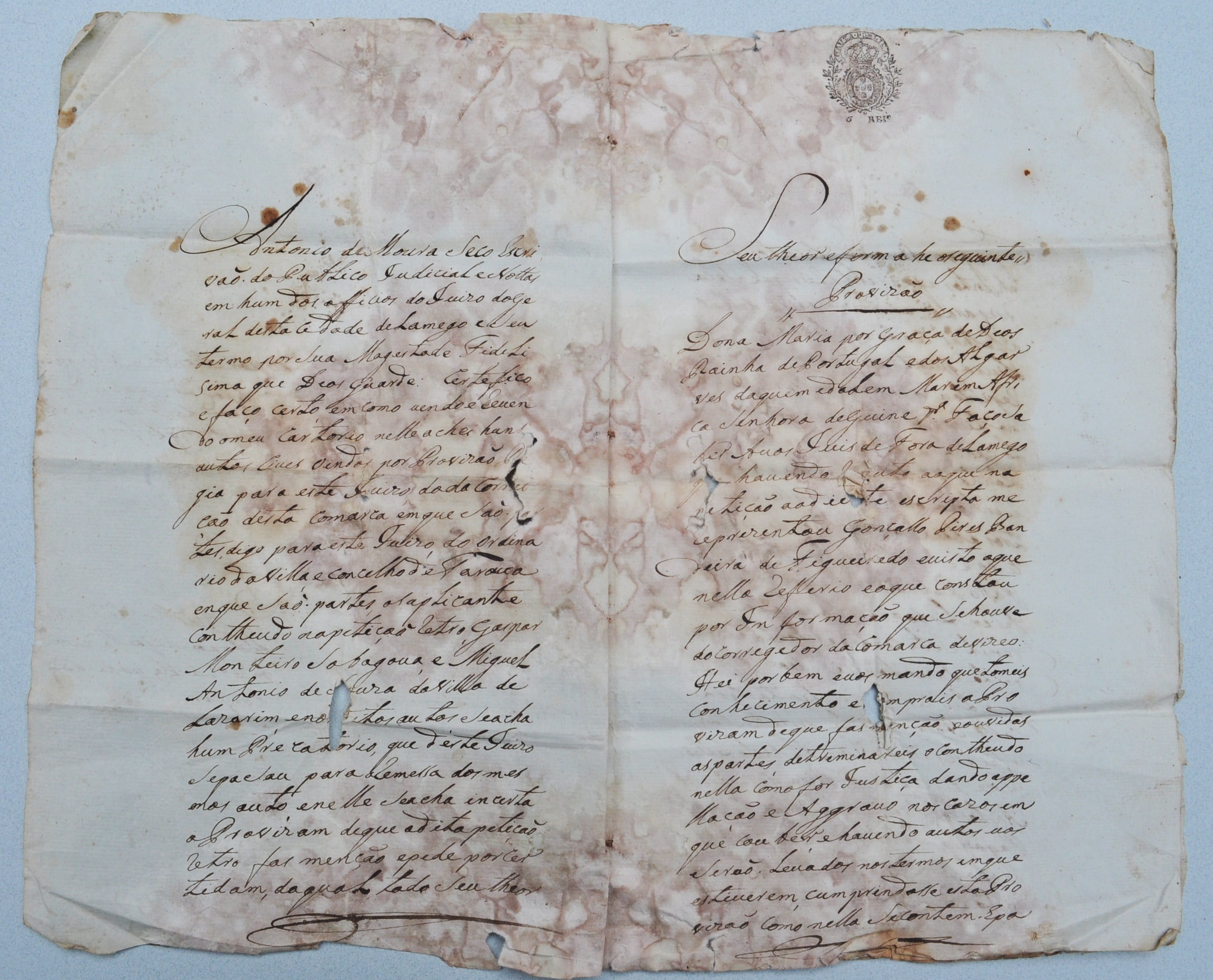 Documento com oito páginas com falhas e muitas manchas de humidade.