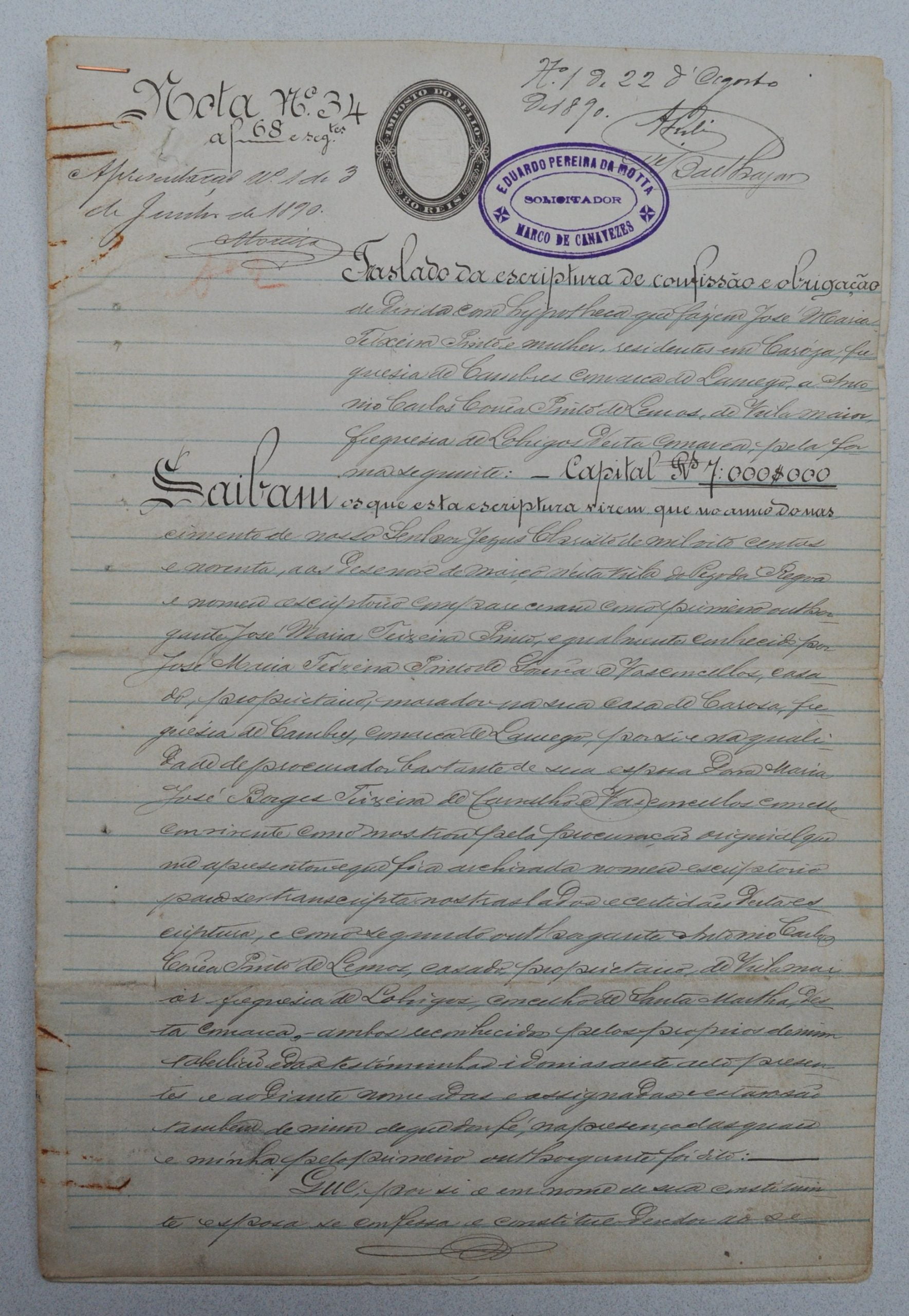 TRASLADO da Escriptura de Confissão e Obrigação, casa da Caroza, 1890, LAMEGO