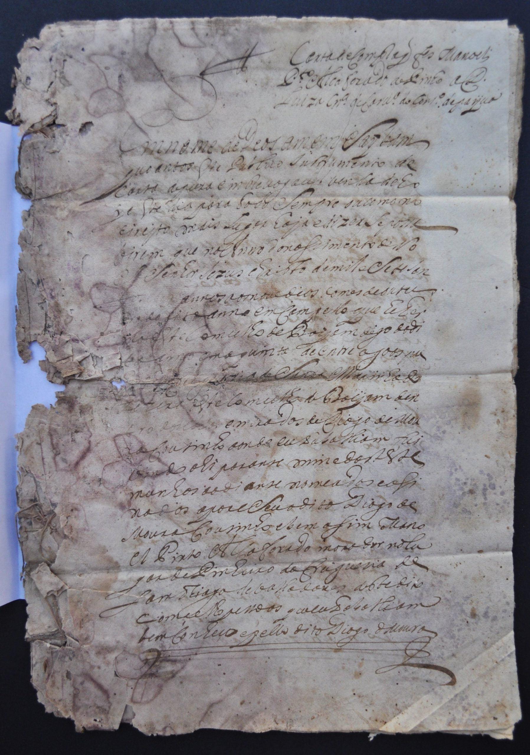 Documento com dezoito páginas com manchas e falhas. Perturbação da mancha caligráfica nas últimas três folhas.