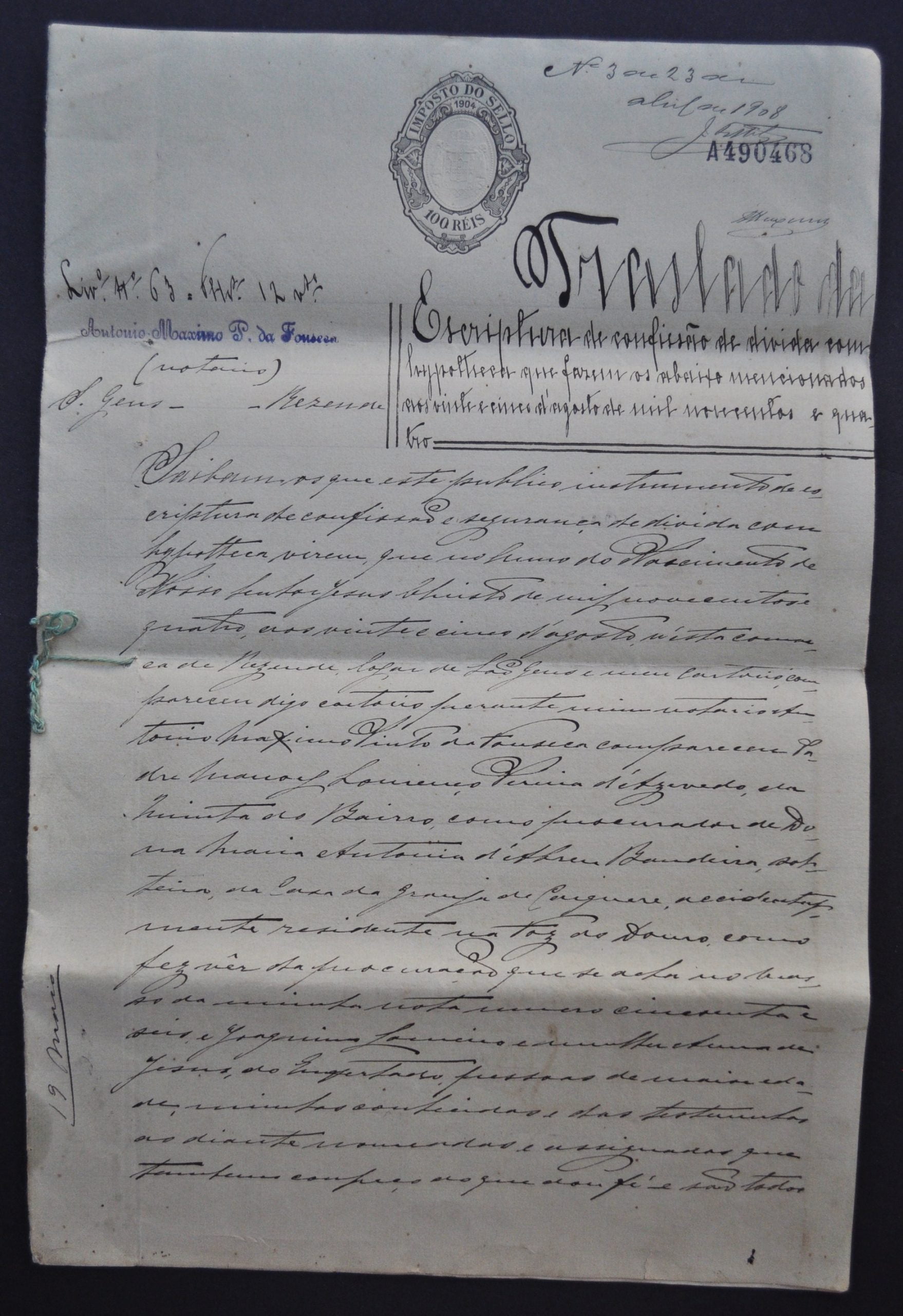 ESCRITURA de Confissão de Dívida, casa de Vila Pouca, 1904 RESENDE
