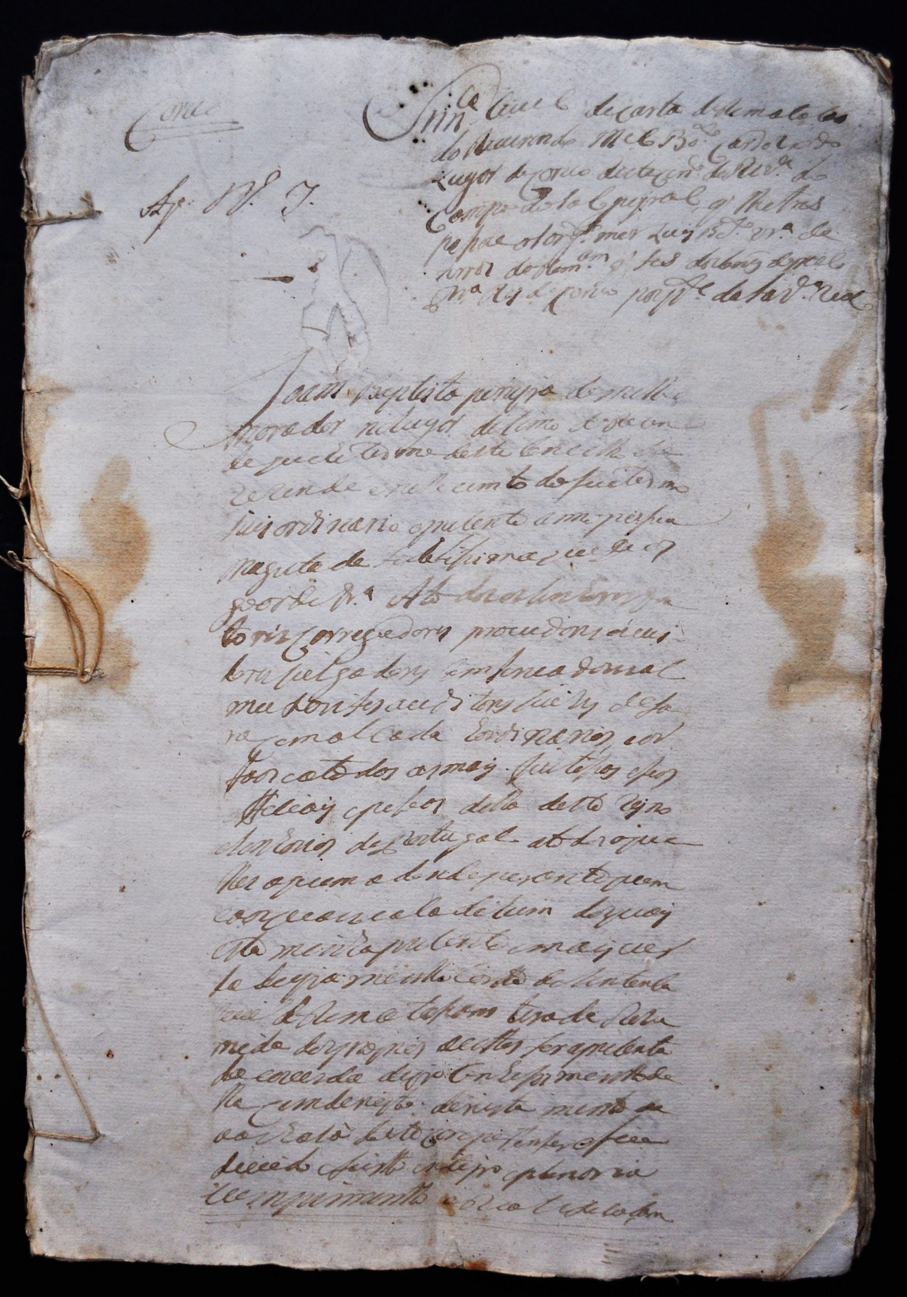 Documento com cinquenta e oito páginas com pequenas manchas e uma pequena falha na última folha.