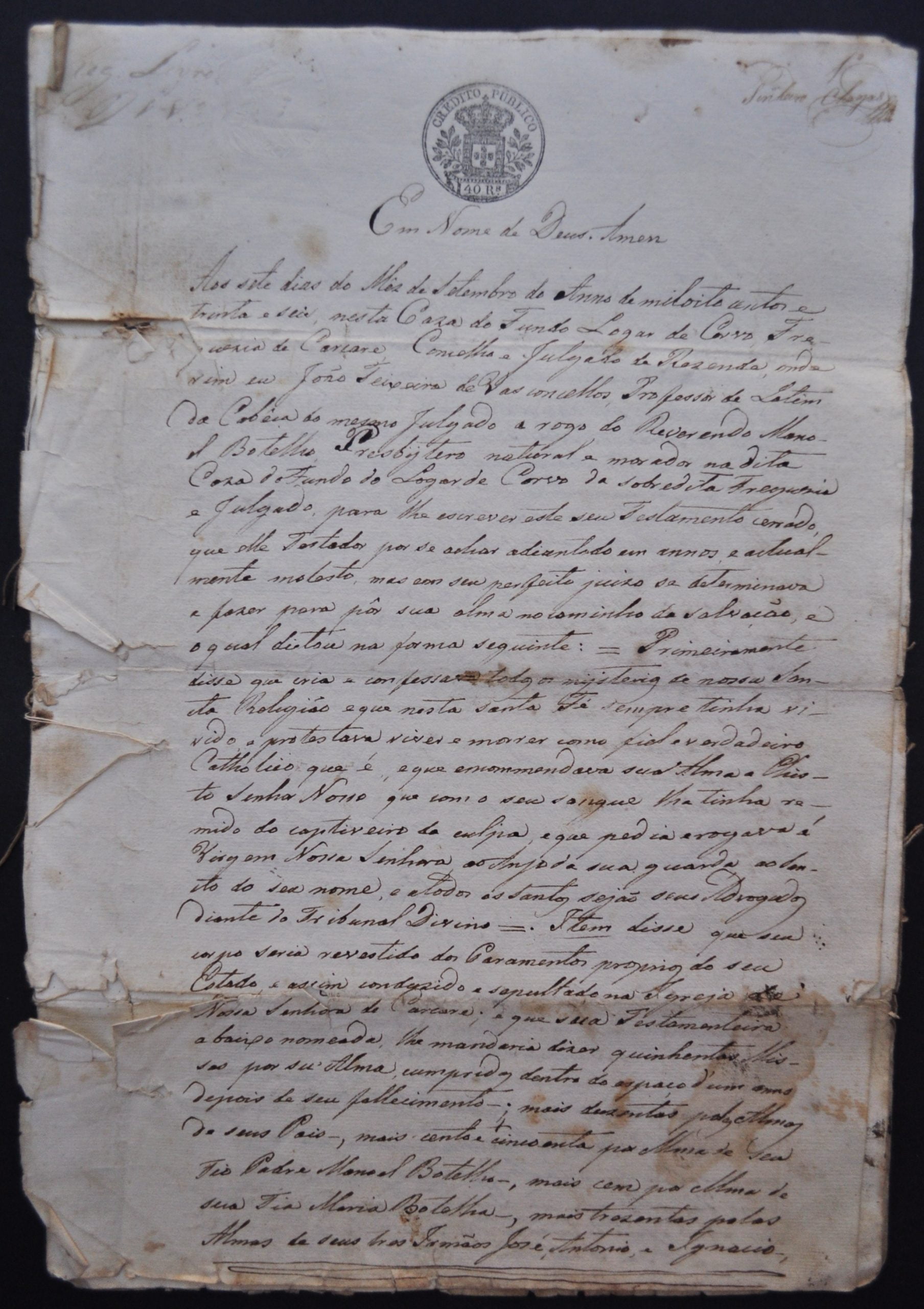 Documento com catorze páginas. Contém aprovação do testamento em 1806 e em 1837. Contém manchas sem perturbação da mancha caligráfica.