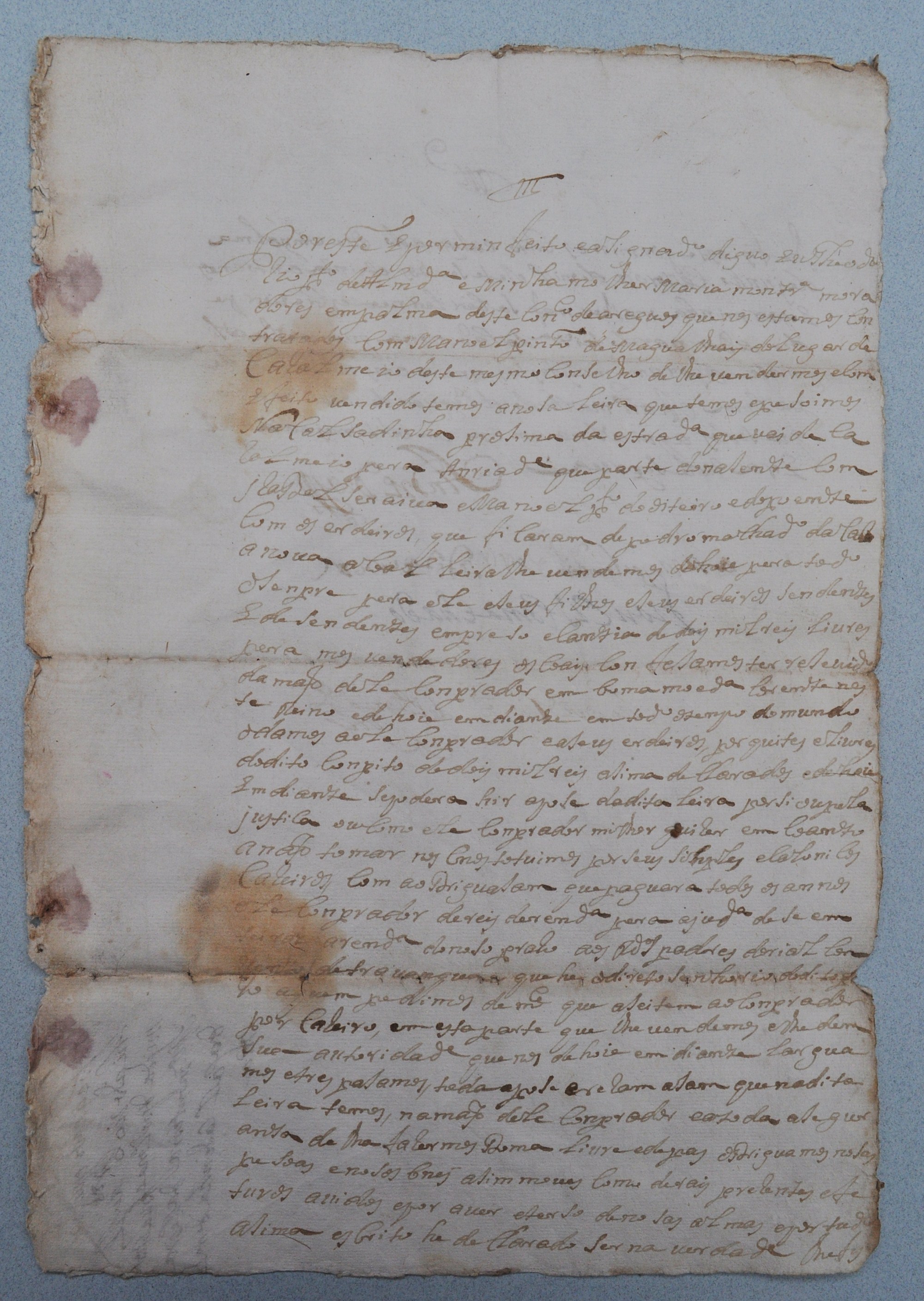 Documento com duas páginas escritas de quatro, em bom estado de conservação, ainda que com pequenas manchas de acidez.