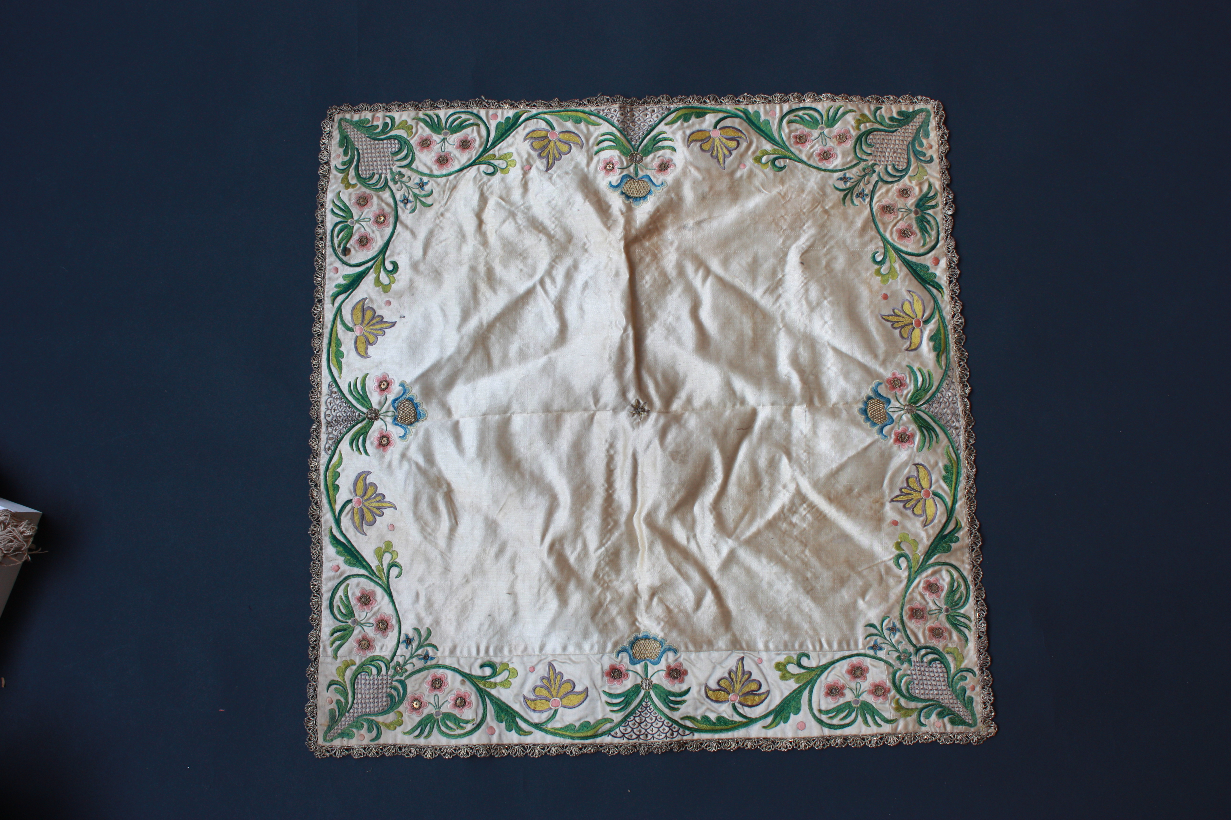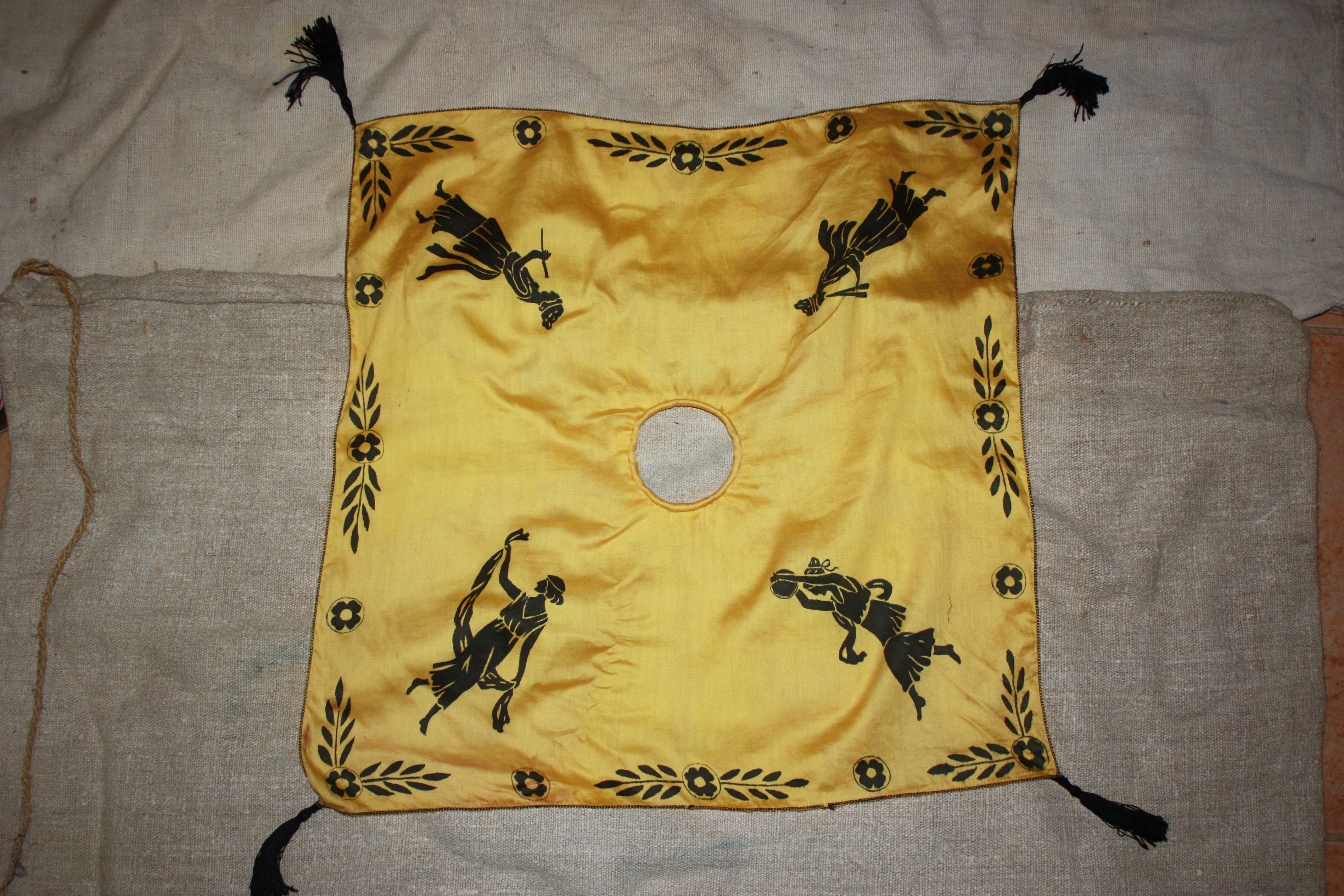 Belo véu de píxide. Confecionado em seda e pintado com belas imagens e rematado, nos cantos, com franjas. Século XIX.
